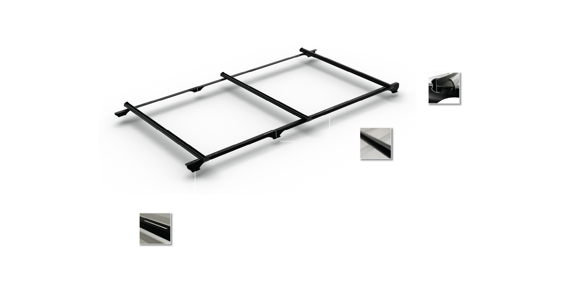 Custom-designed Trade Max mounting rails evenly distribute the weight across the vehicle roof. The zinc-plated, powder-coated rails ensure durability and for utes or vans, there are one- or two-piece sections.