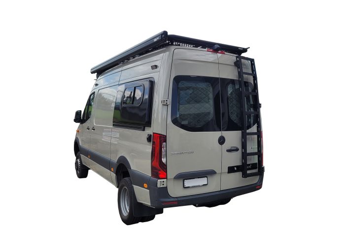 Wedgetail Mercedes-Benz Sprinter Van Ladder, made from robust aluminum with metal mounting components, is designed to aid access to the rear of your roof rack. The ladder sides are styled with the Wedgetail slots design and the treads have a unique anti-slip design.