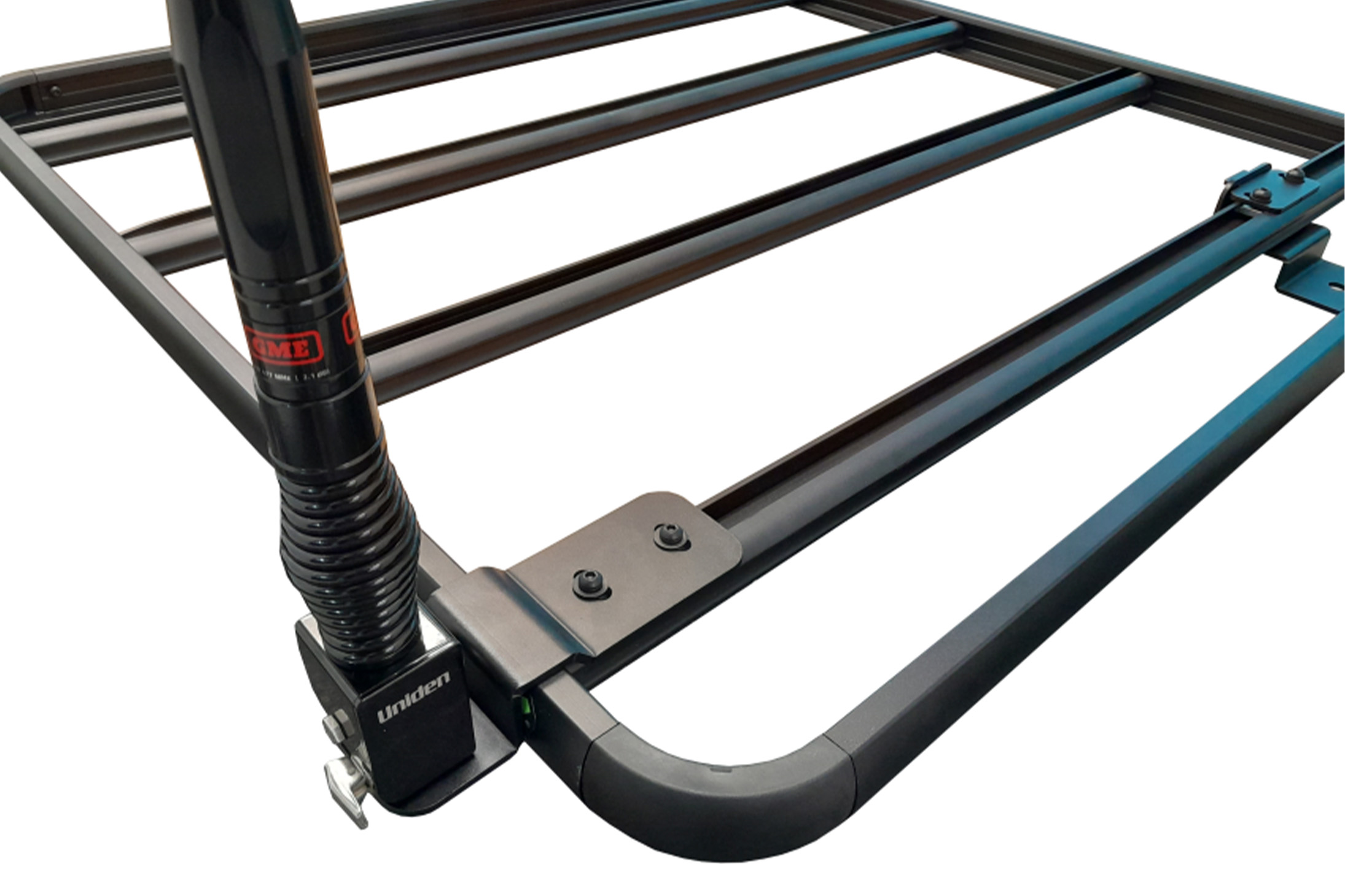 The Wedgetail recessed aerial mount bracket has been designed to accommodate GME, Uniden and other folding aerial mounts. The recessed bracket allows the folding aerial to sit flush with the crossbar surface once in the fully folded position.